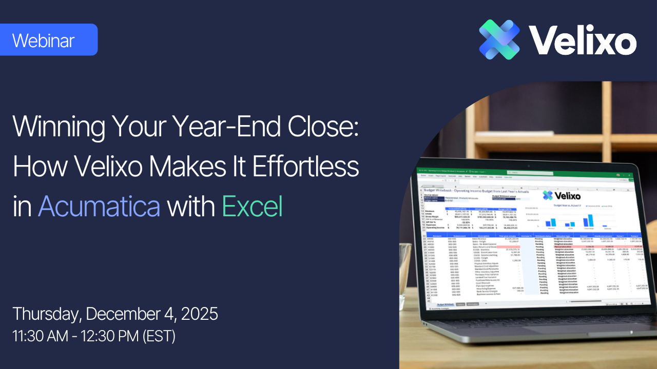 Join us for an exclusive webinar to discover how Velixo’s award-winning software helps you maximize your Acumatica financial reporting, budgeting, and automation. Awarded Acumatica’s Top-notch ISV in 2024 and ISV Partner of the Year in 2025, Velixo is a modern API-based platform connecting Excel with Acumatica in real-time, bidirectionally. It is optimized for fast and accurate reporting & analysis and changes the game with its data push features, allowing for live allocations of journal entries, budgeting and planning. Why Attend? Learn how thousands of happy customers around the world uses Velixo for: multi-dimensional financial reporting & analysis, budgeting & forecasting, financial consolidation, live allocations of journal entries, budgets by dimensions, report distribution by email, or creating entries in any object from Excel data.