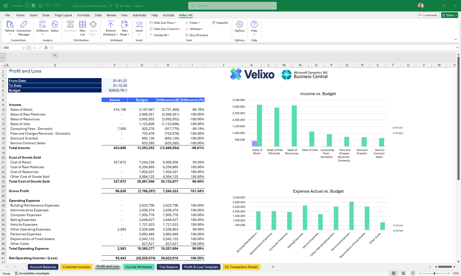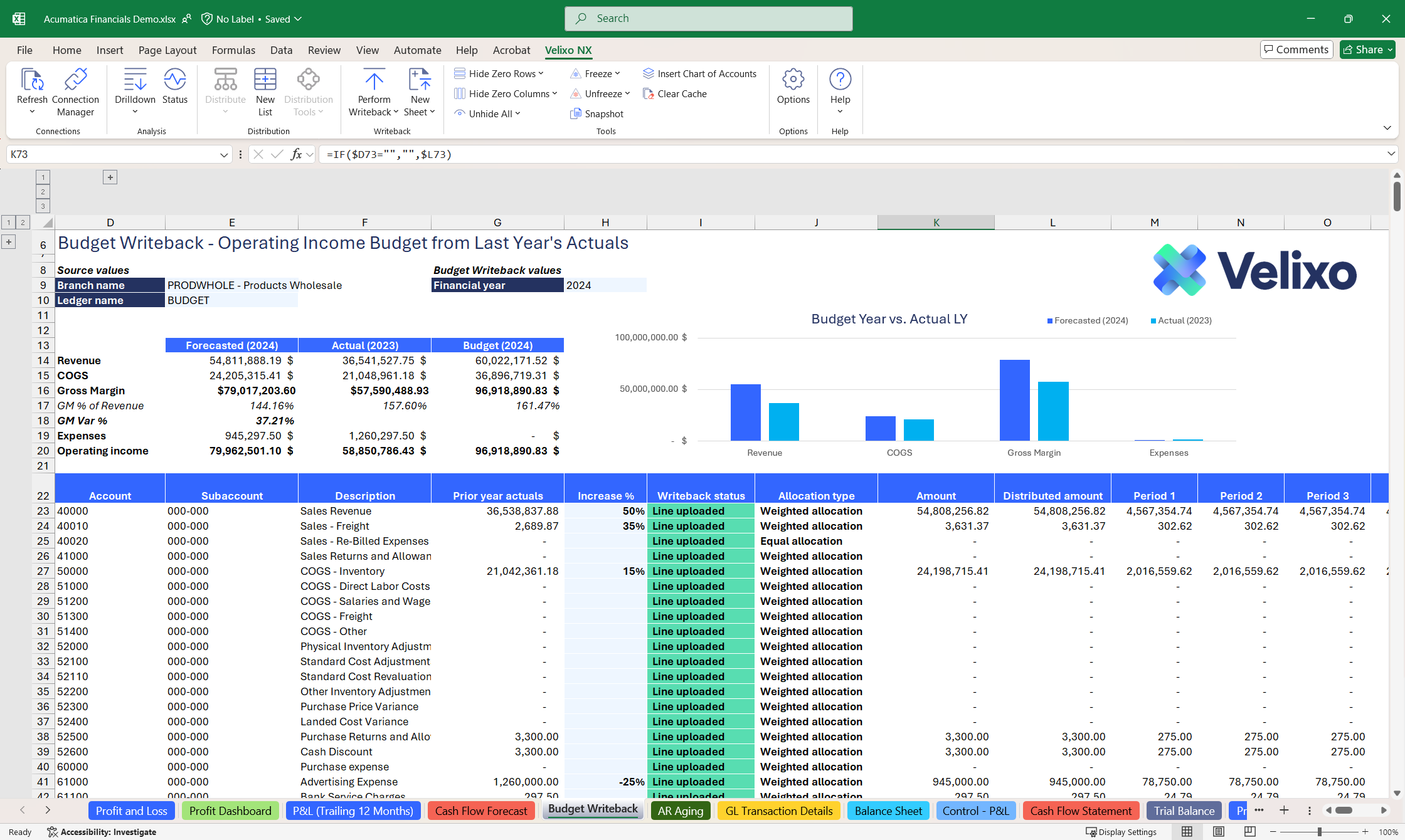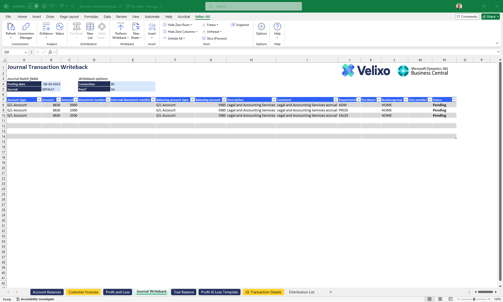 Velixo goes beyond reporting. It enables a function-based approach to pushing data to Business Central from your Excel reports, allowing users to create or update data such as General Ledger journal or budget entries, and combine import flows to their repors. This enables powerful budgeting, forecasting, allocation data import and data quality scenario automations – all from Excel.